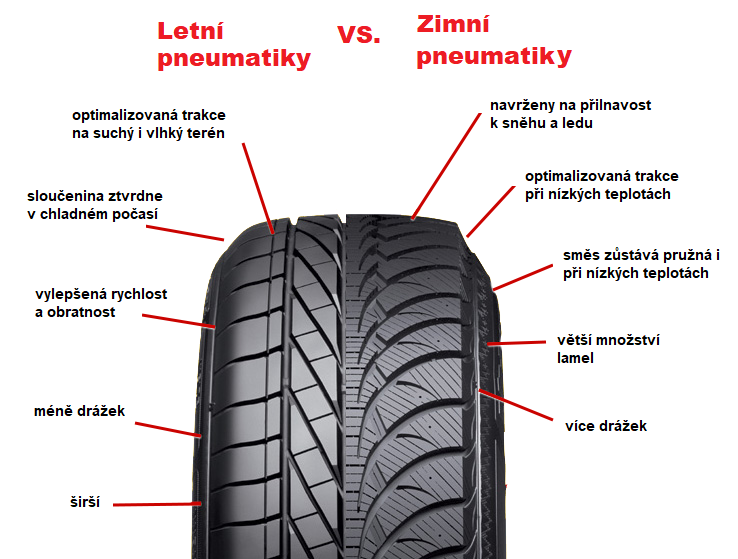 Doporučujeme však používat letní pneumatiky pro zajištění větší bezpečnosti !!! Zimní pneumatiky jsou určeny výhradně pro zimní období, při jejich výrobě se tudíž berou v potaz jiné klimatické podmínky než u letních. Rozdíly jsou jak v brzdné dráze, která je u zimních pneumatik mnohem delší, tak ve vyšší hlučnosti. V porovnání s letním obutím jsou také měkčí, a to díky přísadám, které zabraňují pryži, aby v mrazech tuhla. Na druhou stranu je však tento materiál méně odolný vůči vyšším teplotám. V letních měsících proto zimní vzorek sjedete velice brzy – pomyslná hranice, za kterou se sjíždění zimních pneu urychluje, je nad plus sedm stupňů Celsia.
